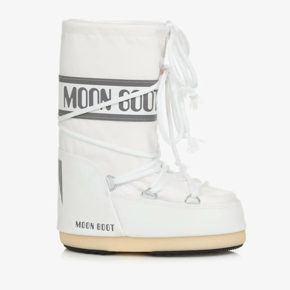White snow boots for boys and girls by Moon Boot, with a silver logo print panel for a bold, branded look. Heavily padded and ultra resistant in the original style, they feature a two-tone thermoplastic sole with little suction pads at the bottom for improved grip. They have faux leather trims, a stylish lace-up look and a drawstring ties on the ankles to lock in warmth. The technological foam lining will feel snug at first but will mould to the size and shape of the foot after a few hours of wear.