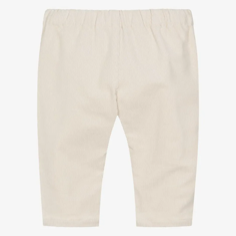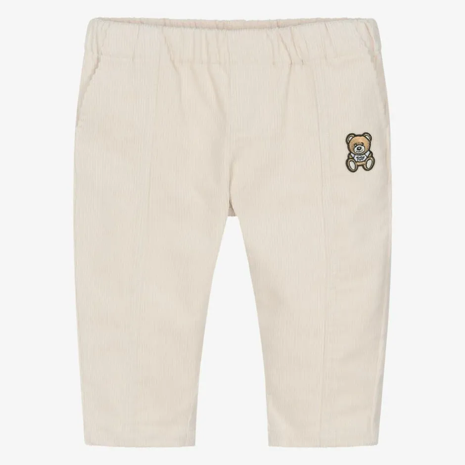 Beige trousers for little boys and girls by Moschino Baby, with the designer's iconic Moschino Teddy Bear appliquéd on the front for brand recognition. Seamed down the front, they are made in soft cotton corduroy, with added stretch for comfort. They have slanted front pockets and a gently elasticated waist for an ideal fit.