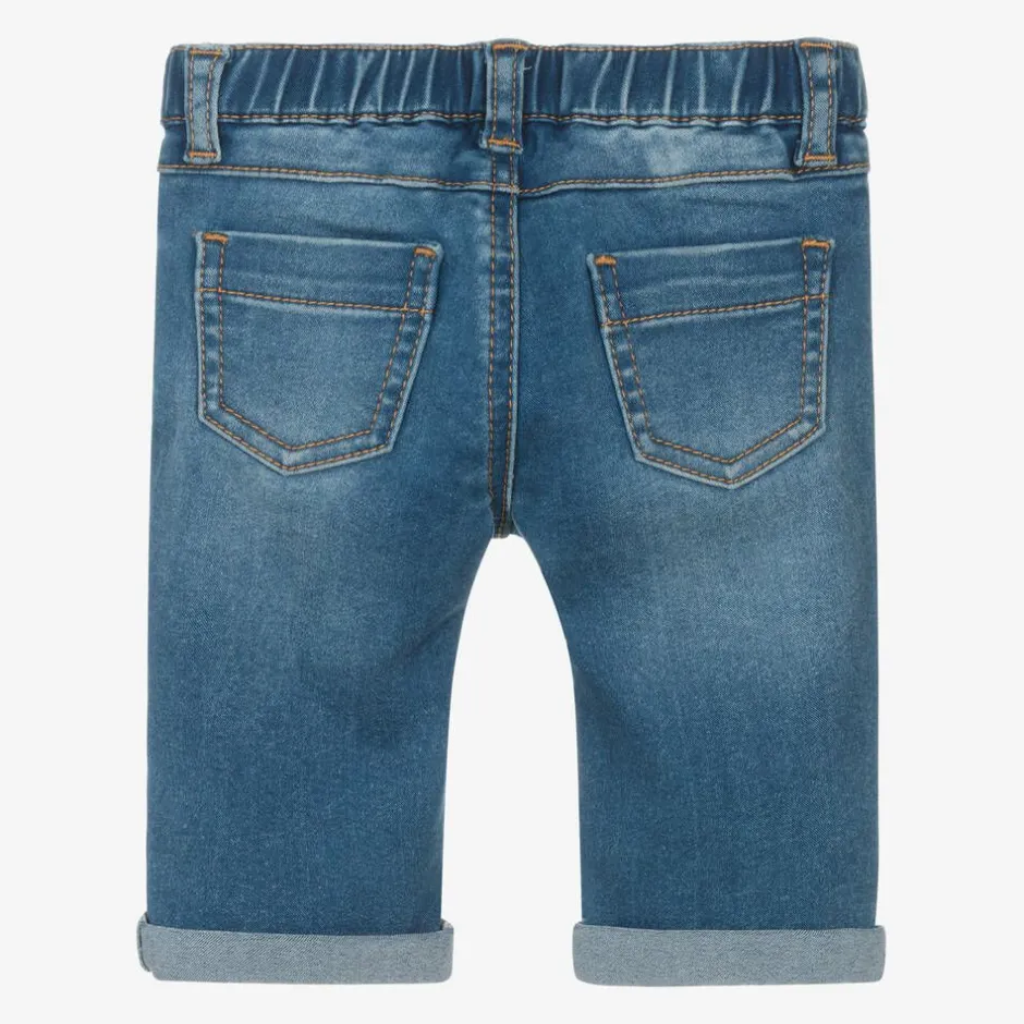 Mid-wash blue jeans for little boys and girls by luxury Italian brand Moschino Baby. In a five-pocket style, they are made in soft, stretchy denim for comfortable wear. They have a gently elasticated waist and fasten with a branded gold-tone popper on the front. For instant designer recognition, the iconic Moschino Teddy Bear badge is on the front, with a branded tab on the coin pocket.
