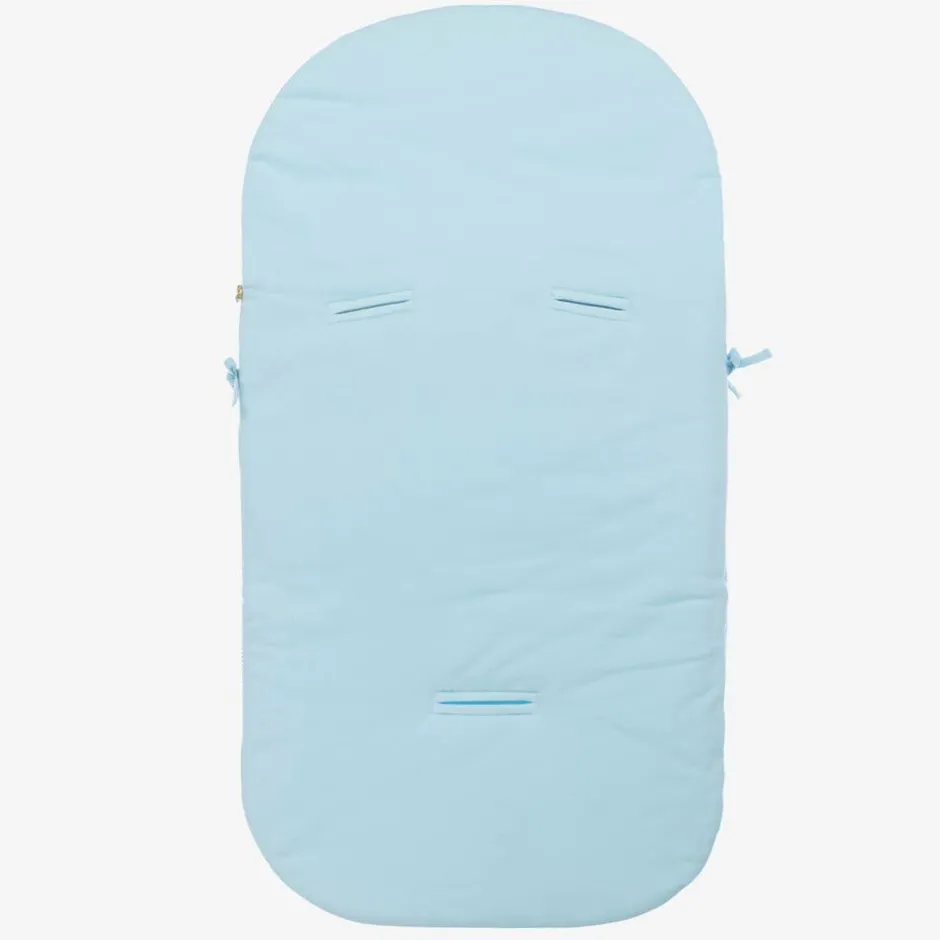 Sky blue nest for baby boys and girls by Moschino Baby, made from cotton jersey for a soft and snuggly feel. Soothing for baby, this padded nest is printed with bold logo lettering and three Moschino Teddy Bear characters. It fastens with a zip down one side and along the base. The white fold-down flap secures with ties at each side and the openings on the back mean it can be easily moved into the car seat or stroller. A black logo patch at the bottom adds further branding.