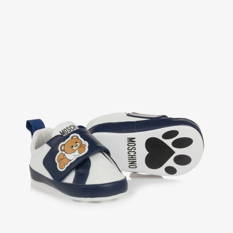 White pre-walker trainers for baby boys by luxury label Moschino, with contrasting navy blue panels. Made from smooth leather with a soft leather lining, they have flexible leather outsoles with a black paw print design for a cute finish. The velcro fastenings are stitched with an iconic Moschino Teddy Bear logo patch and there are branded details printed on the tongues for a signature finish.