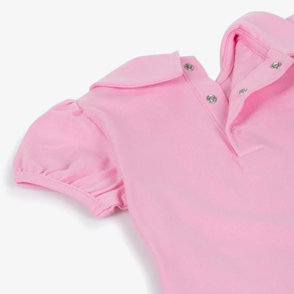 Cute pink T-shirt for little girls by luxury Italian brand Moschino Baby, made in soft, comfortable, cotton jersey. It has pretty puffed sleeves and fastens with poppers on the back. The designer's iconic Moschino Teddy Bears are embroidered on the sweet Peter Pan collar, and a glittery gold logo is embroidered on the chest.