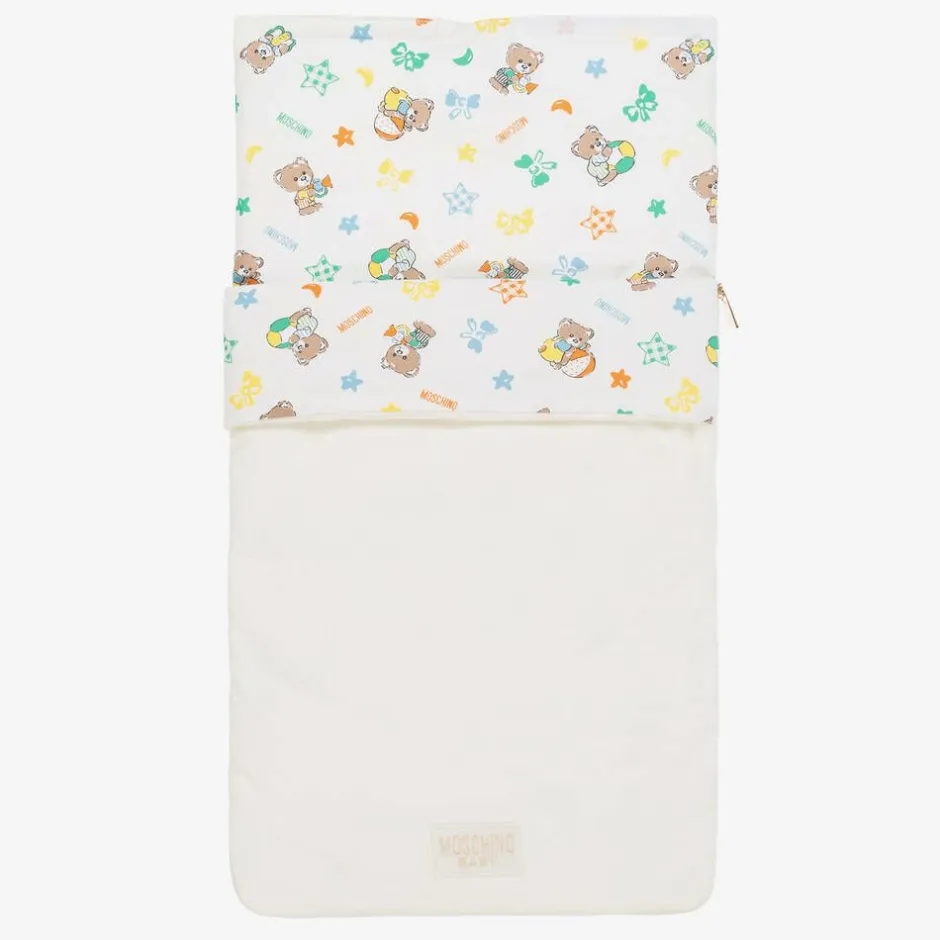 Super sweet, this ivory cotton nest for baby boys and girls is by Moschino Baby. Lightly padded, it is made from needlecord with a soft jersey lining, printed with a fun and colourful Moschino Teddy Bear logo pattern. Fastening with a zip on the side and the base, it has practical openings on the back for use in a car seat or stroller and is stitched with a tonal branded patch for a distinct finish. There are velcro strips on the hood so it can be unfastened and laid flat like a pillow.