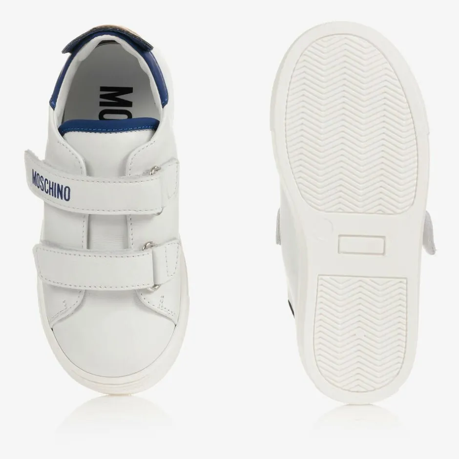 White and blue leather trainers for younger boys and girls by Moschino Baby. The blue trims have Moschino Teddy Bear appliqué on the back and there are two velcro straps for easy dressing. They have a soft leather insole and a non-slip rubber outer sole.