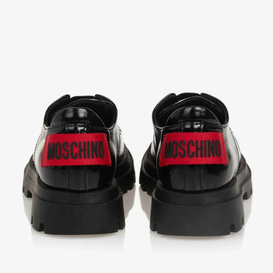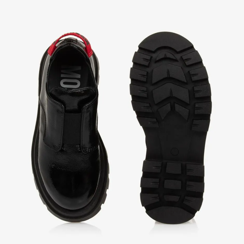 Black patent loafers for boys and girls by Italian fashion house Moschino, made and lined in luxurious leather. Contrast red logo details on the heels add a cool splash of colour to these sleek shoes. They slip on easily thanks to elasticated panels on the front. These non-slip shoes have chunky, rubberised soles for an edgy look.