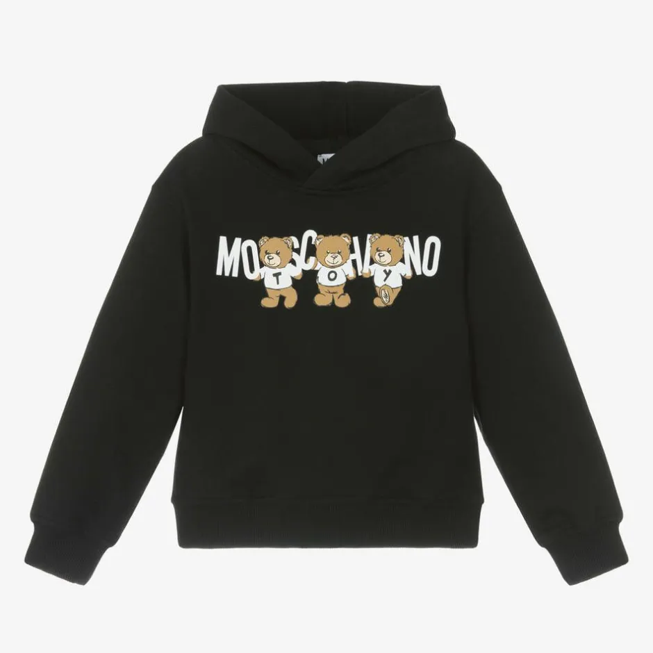 This black cotton hoodie for boys and girls is from Moschino Kid-Teen. Made in mid-weight jersey and styled with dropped shoulders, this cosy layer has a fleece-feel underside. Three Moschino Teddy Bears, the label's famous character, are printed on the front for added designer appeal.