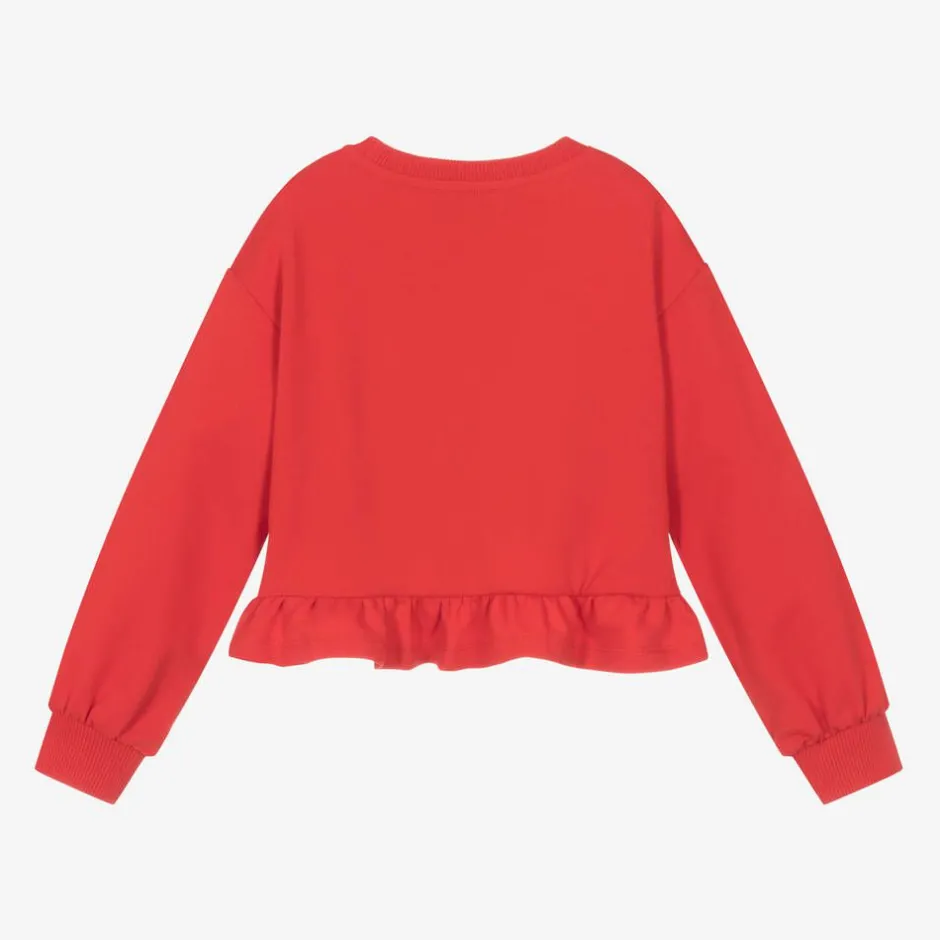 Red cotton sweatshirt for girls by Moschino Kid-Teen, in a stylish boxy fit with a ruffle hem. Made in soft and comfortable jersey, it has a cute Moschino Teddy Bear love heart design on the front, along with a gold logo print for a sweet designer look. A crew neckline and lightly ribbed trims complete the casual look.