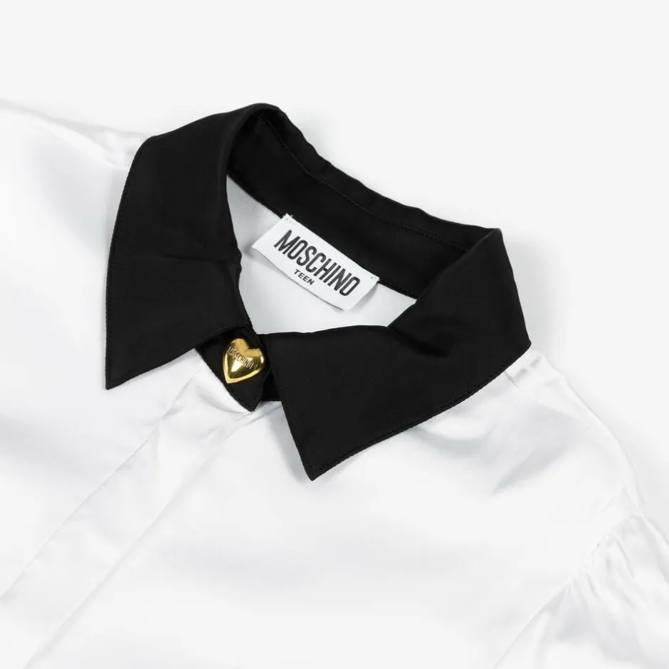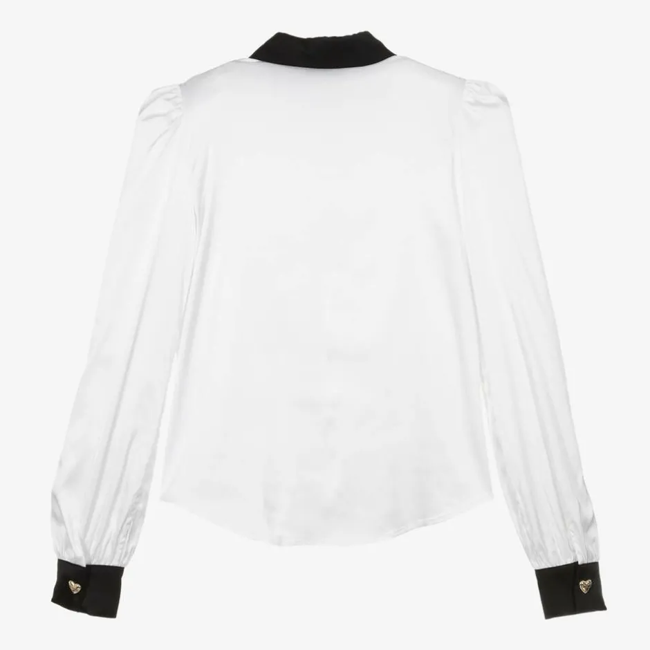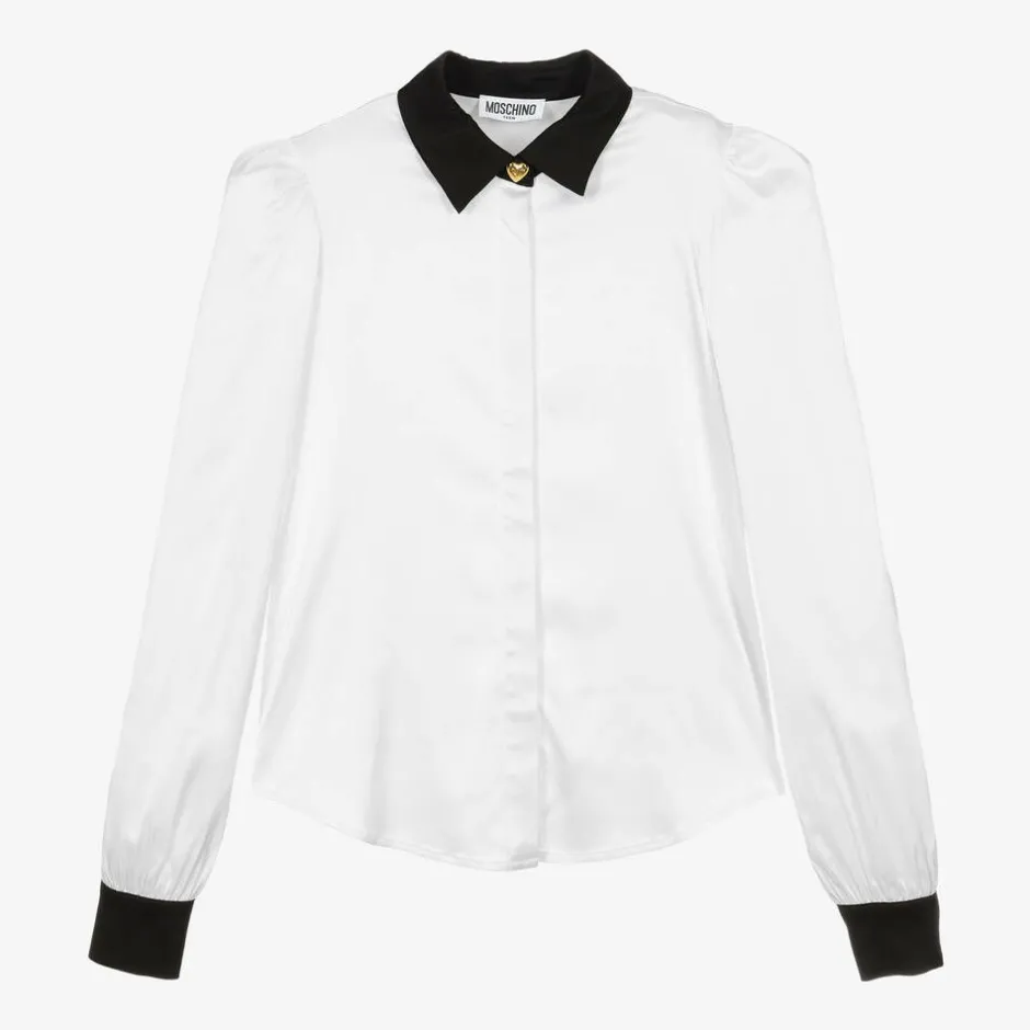 Mini-me white blouse for older girls by Moschino Kid-Teen, made in silky viscose satin. With a gorgeous sheen, this stylish top has a contrasting black collar and cuffs, which fasten with a heart-shaped gold logo popper. The long sleeves are gently puffed and, for a neat finish, there are concealed button fastenings on the front.
