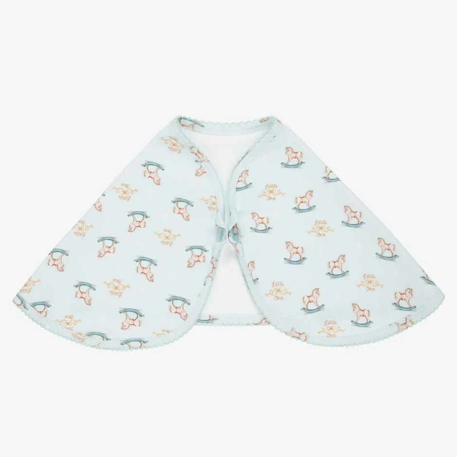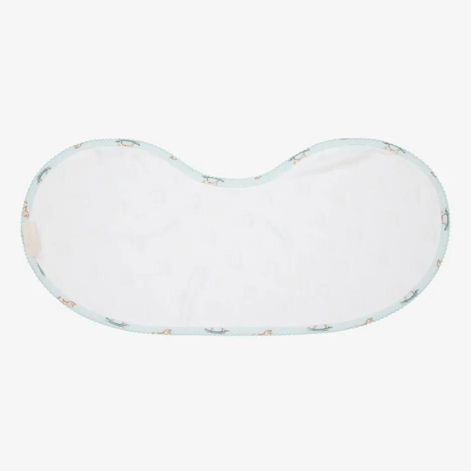 Pale blue burp cloth for baby boys from My Little Pie, patterned with a charming rocking horse design and the words 'Little One'. Generously sized, this useful feeding accessory is made in super soft, organic Supima cotton jersey. The unique shape makes it ideal as a burping cloth or as an absorbent, popper fastening bib.