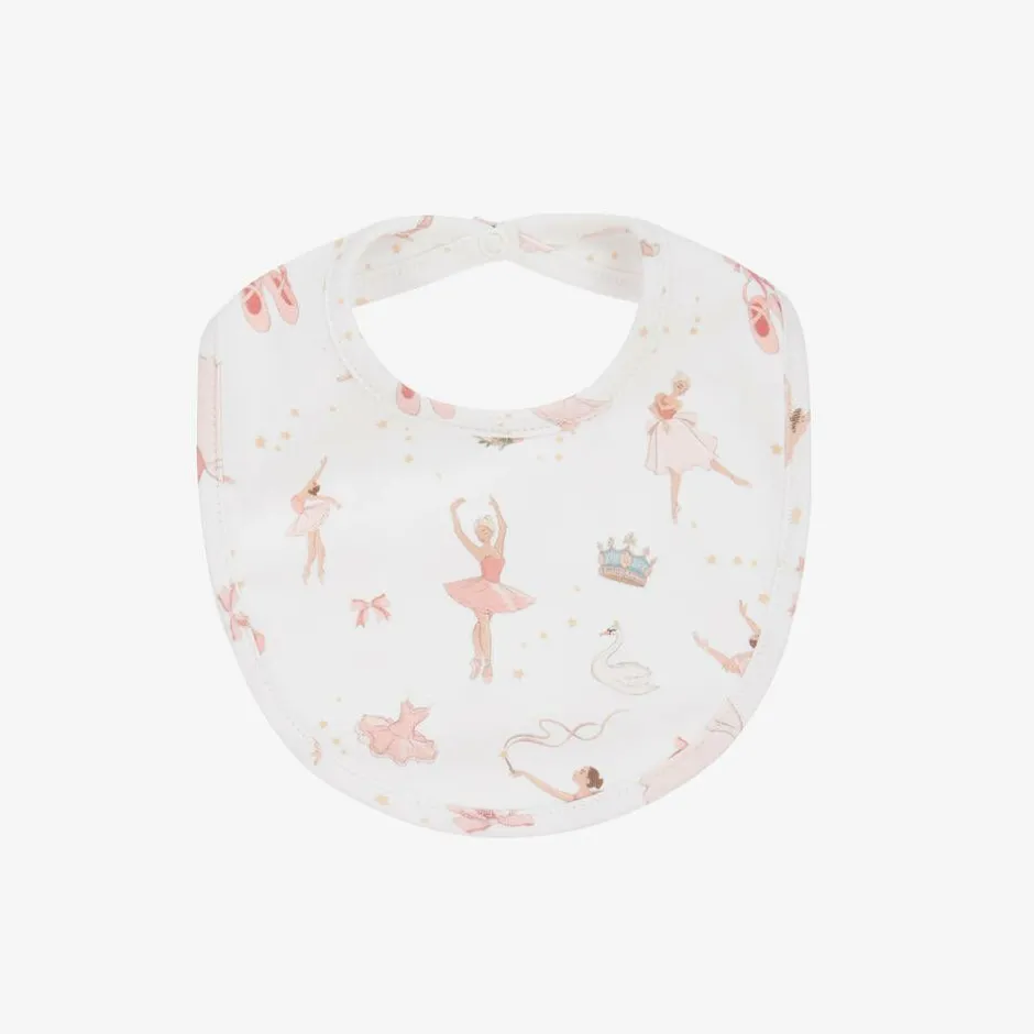 A white bib for baby girls by My Little Pie, made and lined in super soft, organic Supima cotton jersey. Great for catching little spills, this sweet feeding accessory is patterned with a charming ballerina and swan print in pink. It secures easily on the back of the neck with a popper.