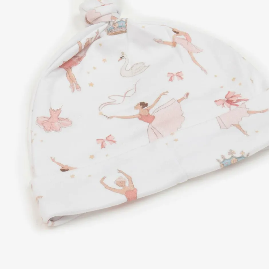 A charming white layette hat for baby girls from My Little Pie, patterned with a lovely ballerina and swan design in pink. Made in beautifully soft organic Supima cotton jersey, this comfortable hat has a sweet turn-up brim and a cute top knot.
