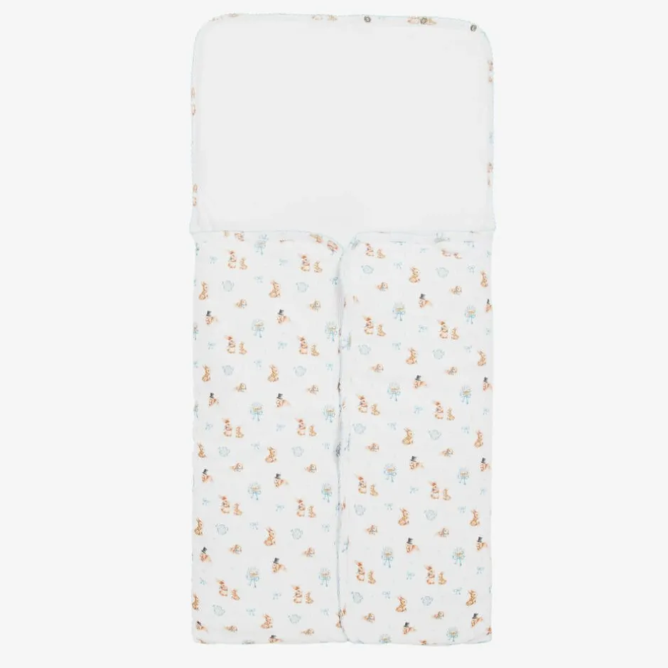 White padded nest for baby boys by My Little Pie, made from beautifully soft organic Supima cotton jersey. Ideal for keeping your little one cosy and warm, it has a sweet bunny rabbit pattern and an embroidered blue picot trim. When unfastened it can be laid flat, providing a comfortable surface for changing or playing.
