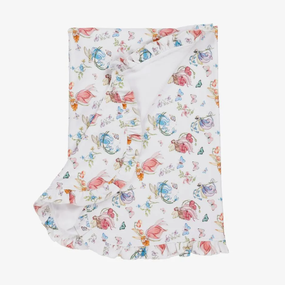 Patterned in a delightful flower fairy print in blue and pink, this white blanket for baby girls is by My Little Pie. It is made in a double layer of super soft organic Supima cotton jersey, with a pretty ruffle trim. Ideal for use in the car seat or stroller, it also makes an attractive nursery accessory.
