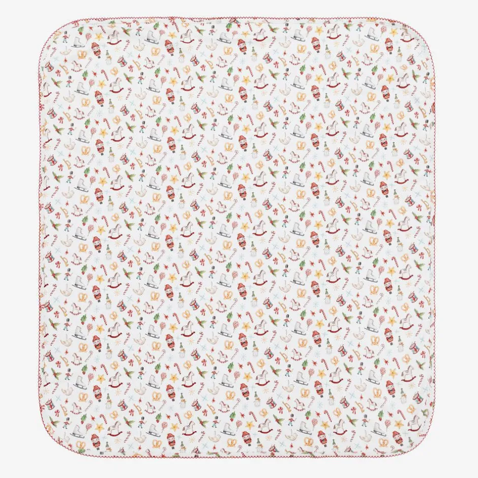 Patterned in a delightful Christmas-themed print in red and green, this white blanket for baby boys and girls is by My Little Pie. It is made in a double layer of super soft organic Supima cotton jersey, with delicate picot embroidery trim. Ideal for use in the car seat or stroller, it also makes an attractive nursery accessory.