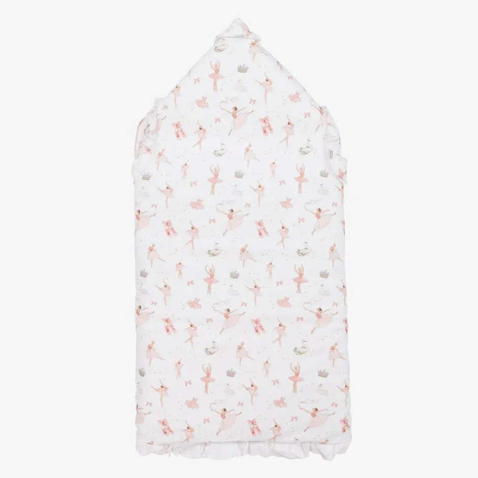 White nest for baby girls by My Little Pie, made from beautifully soft organic Supima cotton jersey and gently padded for an extra cosy feel. It is patterned with a charming ballerina and swan design in pink and edged with a pretty ruffle and embroidered, pink picot trim. There are popper fastenings on the front and hood, allowing it to be opened and laid flat, providing a comfortable surface for changing or playing.