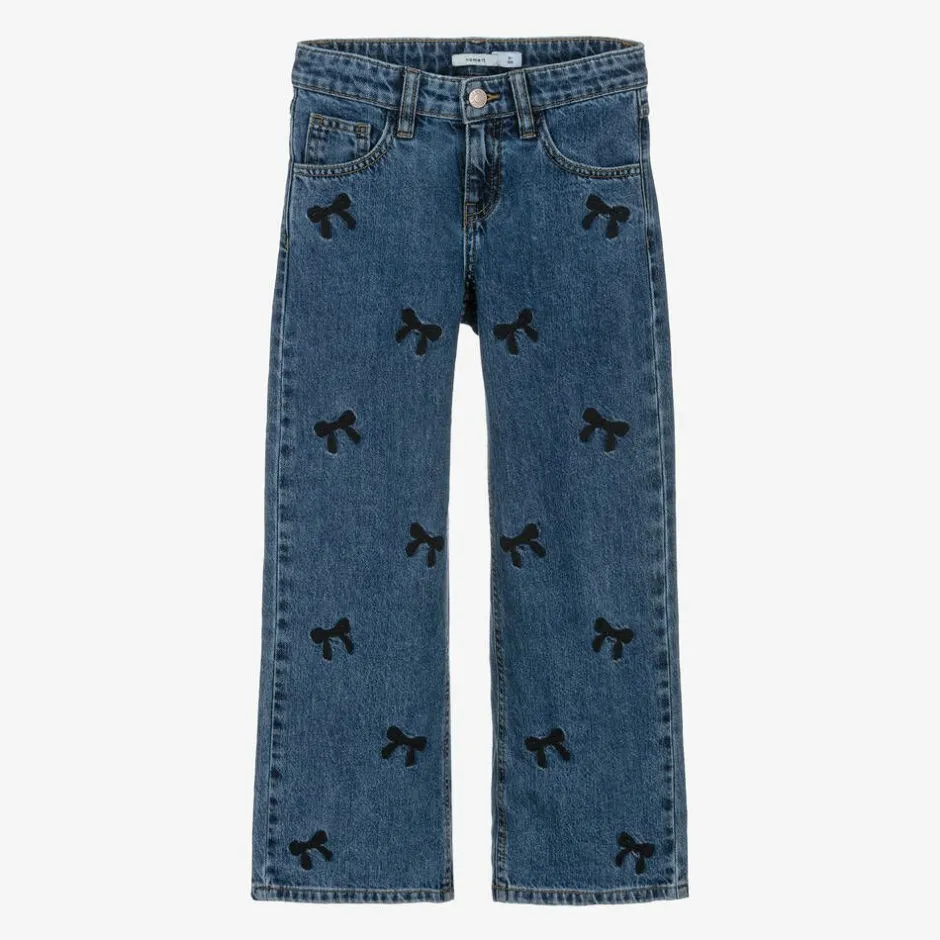 Mid-blue wash wide-leg jeans for girls by Name It, made from denim with organic cotton. They are embroidered with pretty black bow motifs, adding a touch of sweetness to this casual style. Complete with the classic five-pocket styling, they fasten with a zip and clasp on the front and have an adjustable waist for a comfortable fit.
