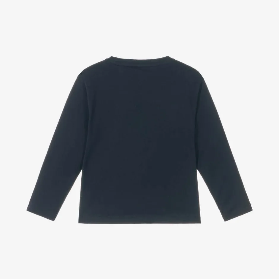 Navy blue top for girls by Name It, with a tea cup full of festive cheer printed on the front. It is made in a comfortable, organic cotton-blend jersey.