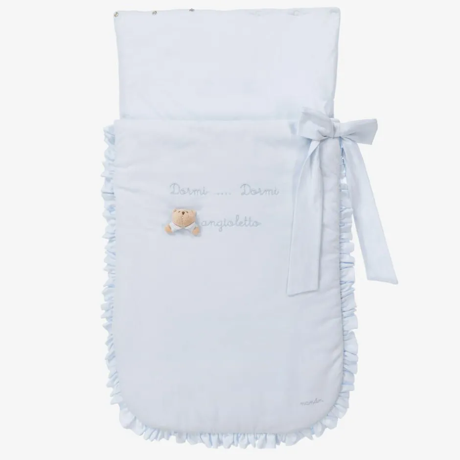 A light blue baby nest for boys and girls by Nanán, made in soft cotton jersey with lightweight padding. Warm and cosy, it has an easy zip fastening down one side and across the bottom. There are popper fastenings on the hood, which can be opened and laid flat like a pillow. It has a decorative ruffled trim around the edge, as well as a fixed bow and a sweet teddy bear appliqué on the front. The tonal embroidery reads 'Sleep… sleep little angel' in Italian, along with the brand's name seen in one corner.