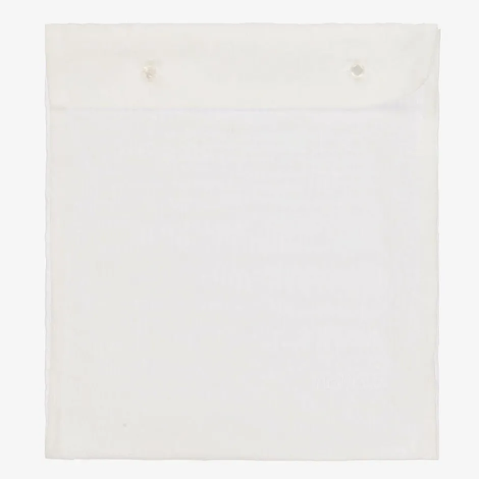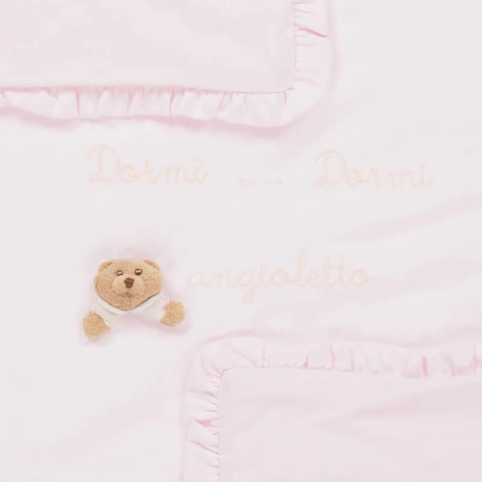 A lovely light pink blanket for baby girls by Nanán, made in soft cotton jersey with light padding. Ideal for the cot or pram, this cute accessory has a decorative ruffled trim around the edge and a sweet teddy bear appliqué on the front. The tonal embroidery reads 'Sleep… sleep little angel' in Italian, along with the brand's name seen in one corner. It comes with a buttoned fabric bag for easy storage.