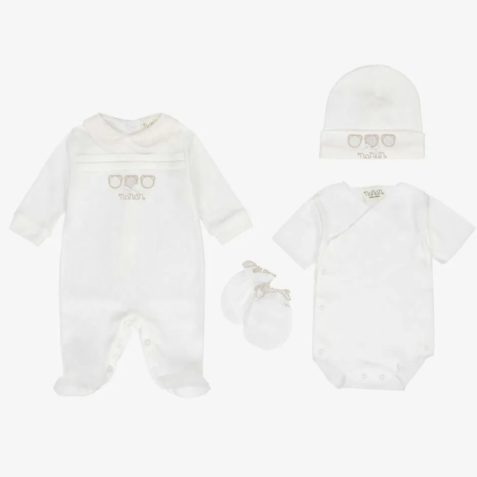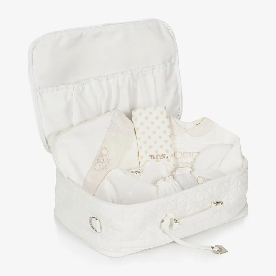 Luxury white suitcase by Nanán, made from faux leather with a diamond quilting pattern and a silky lining. A lovely gift for parents-to-be, it is ideal for use as a hospital or overnight bag and comes with a babygrow, bodyvest, hat, mittens, muslin and towel, all in beautifully soft organic cotton. The bag has two zipped compartments with useful internal pockets, and a further velcro pocket on the front. There is a useful carry handle and a detachable, adjustable shoulder strap.