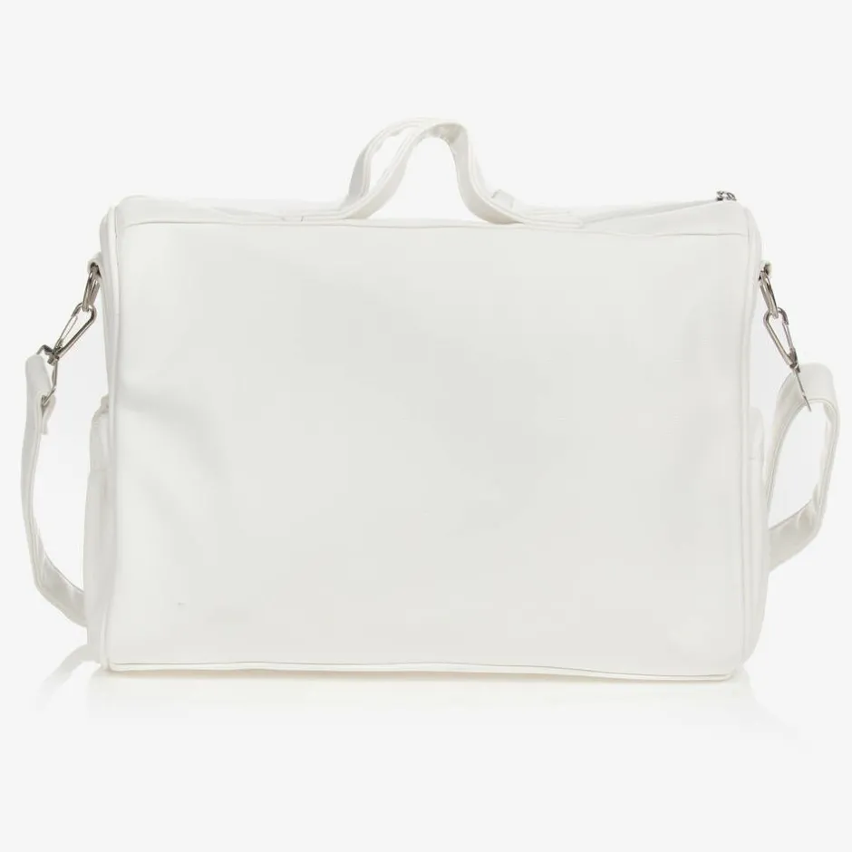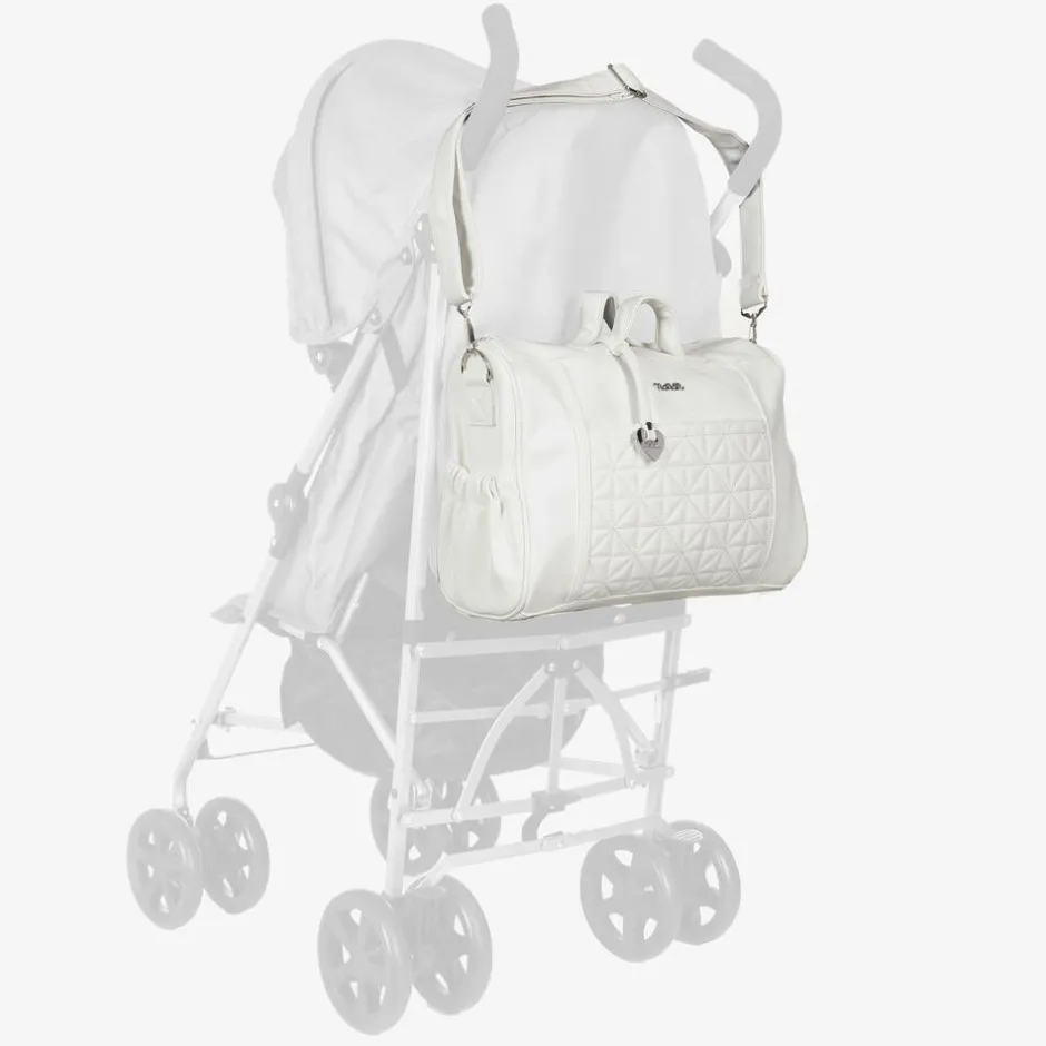 Lovely white changing bag by Nanán, made in soft faux leather with a smooth, luxe feel. The front has a stylish quilted front pocket, with a shiny silver logo appliqué and useful side pouches for bottles and other essentials. Featuring a silky, logo-print lining, it has a spacious main compartment with an internal elasticated pouch to keep belongings organised. It comes with a matching, quilted changing mat and has an adjustable, detachable shoulder strap.