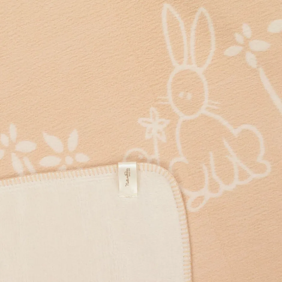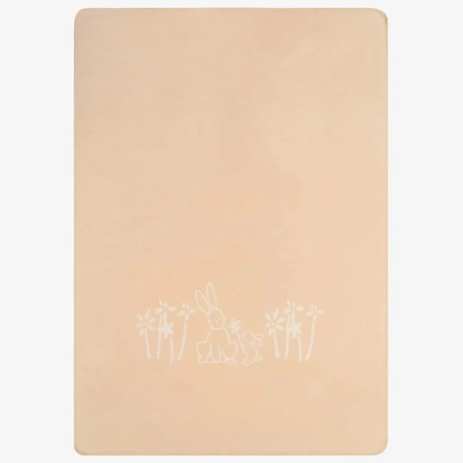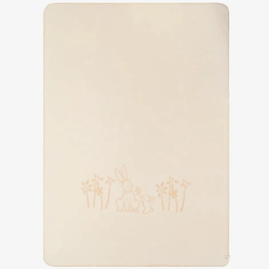 Ivory blanket for baby boys and girls by Naturapura, made in soft organic cotton with a luxuriously soft fleecy feel. A charming nursery accessory, this blanket is patterned with cute bunnies and pretty flowers in contrasting shades on each side.