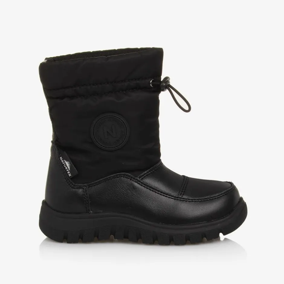 Black waterproof boots for boys and girls by Naturino, protecting feet from snow and rain. Designed with a soft leather upper and a silky smooth shaft, they are lined in soft sherpa fleece for cosy warmth. This easy, pull-on style is secured with an elastic drawstring and toggle for added protection. The Natex waterproof membranes draw out moisture, keeping feet warm and dry in all weather. For good grip, they have a chunky, deep tread rubber outsole.