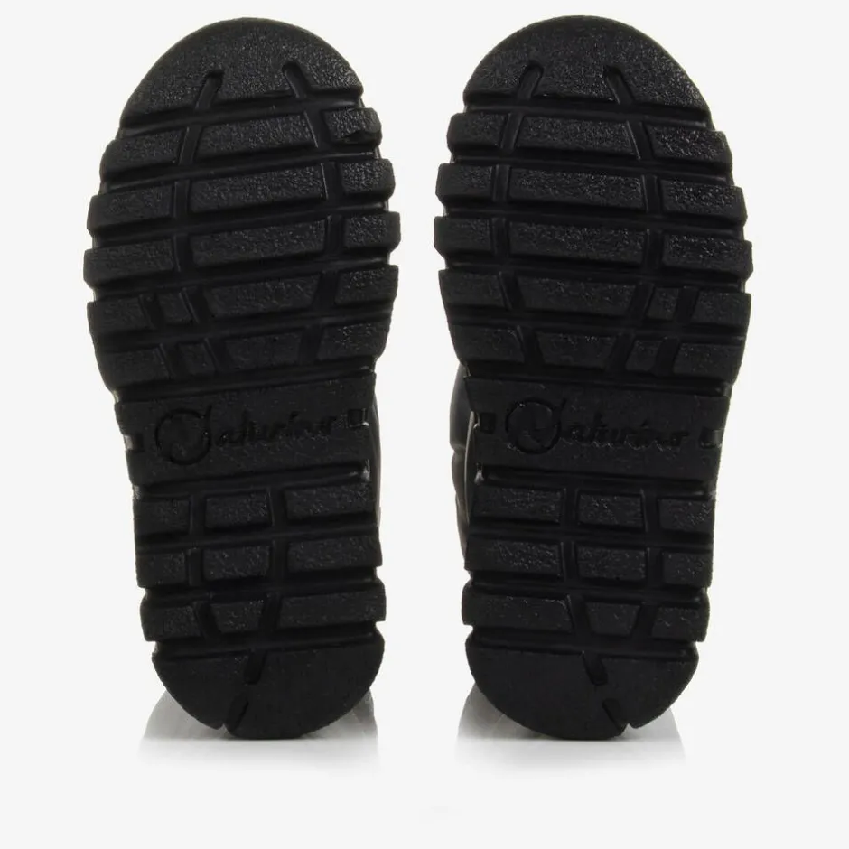 Dark silver waterproof snow boots for boys and girls by Naturino, with a matching leather trim. Ideal for wet weather, these slip-on boots have a warm fleecy lining and a drawstring toggle fastening around the ankle to keep the cold out. The non-slip rubber outsoles provide good grip, and there is a holographic logo patch on the front for a cool, designer finish.