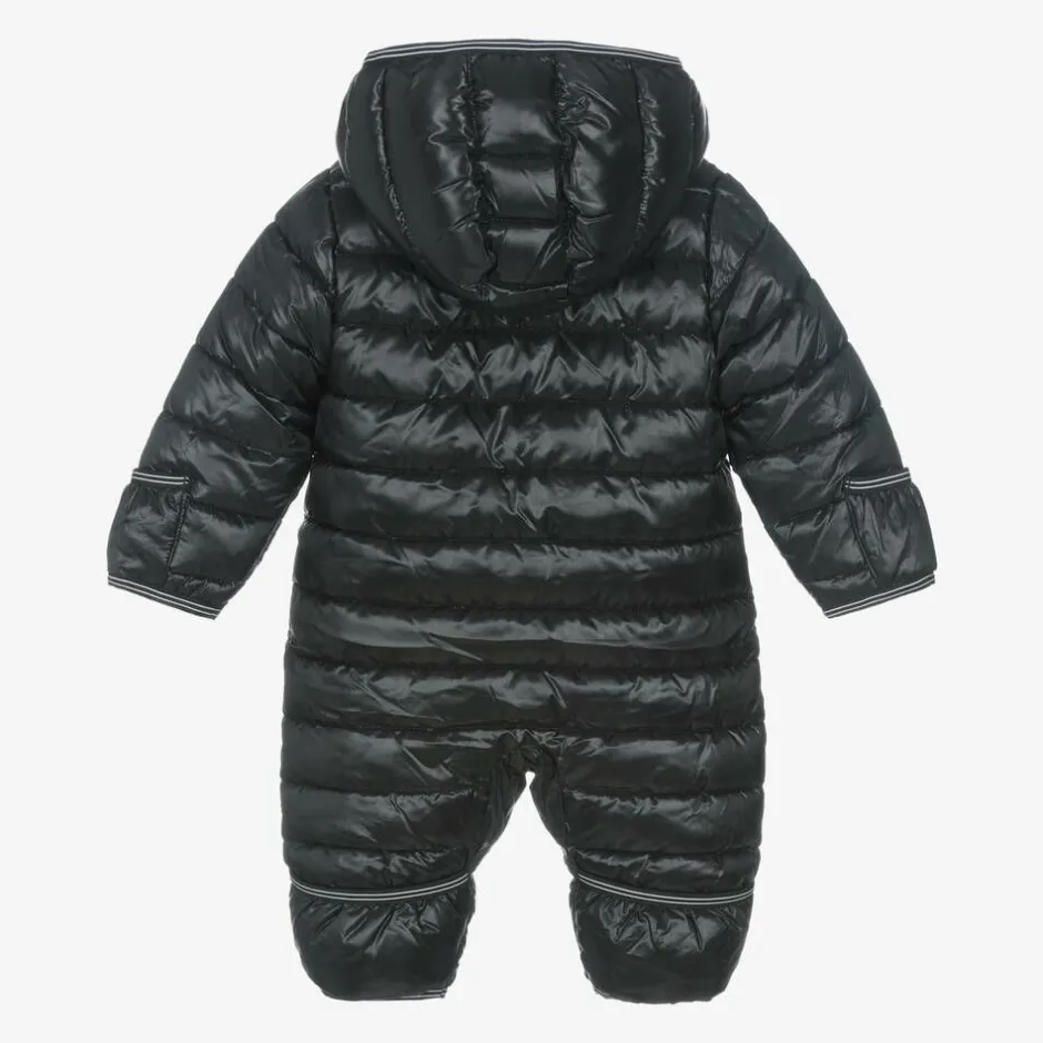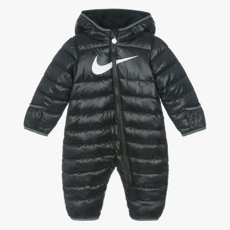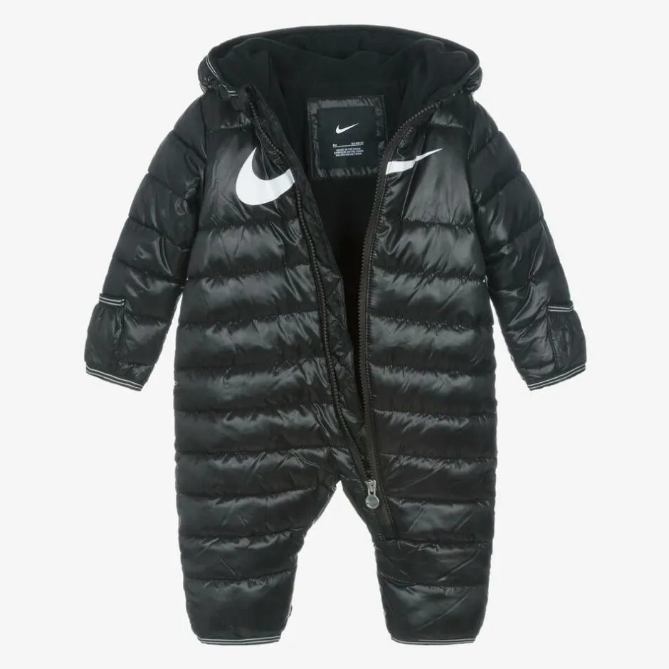 Black water-repellent snowsuit for baby boys and girls by Nike, made in smooth fabric with a glossy sheen. Padded for warmth, this cosy all-in-one is printed with a white Swoosh logo for instant brand recognition. It has gently elasticated trims with white stripes and a hood to protect the face and neck from wind and rain. It is comfortably lined with soft polar fleece and fastens on the front with a full-length zip. Fold-over mitts and feet help to keep little ones warm and dry in cold and wet conditions.