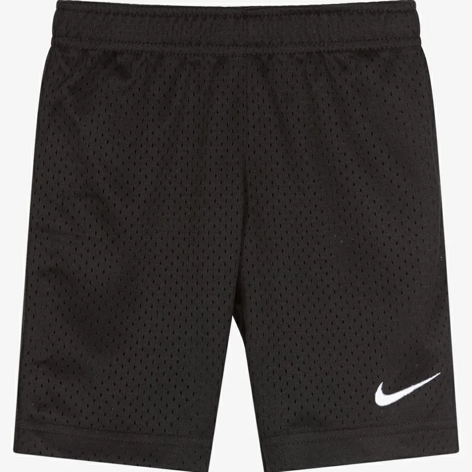 Black sports shorts for boys by Nike, made in silky perforated polyester, for breathability. They have an elasticated waist and an embroidered white Swoosh logo on the front.