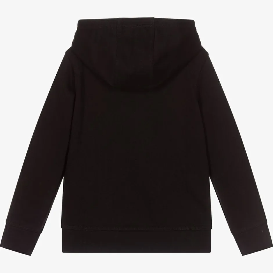 Boys black zip-up hooded top by sports brand, Nike. The soft jersey polycotton fabric has a fleece feel, with a brushed fleece interior. There are front pouch pockets and white logo embroidery at the chest.
