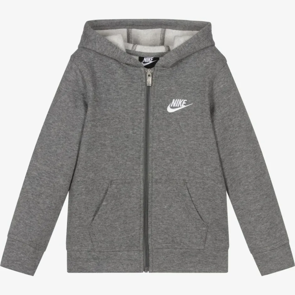 Boys grey zip-up hooded top by sports brand, Nike. The soft jersey polycotton fabric has a fleece feel, with a brushed fleece interior. There are front pouch pockets and white logo embroidery at the chest.