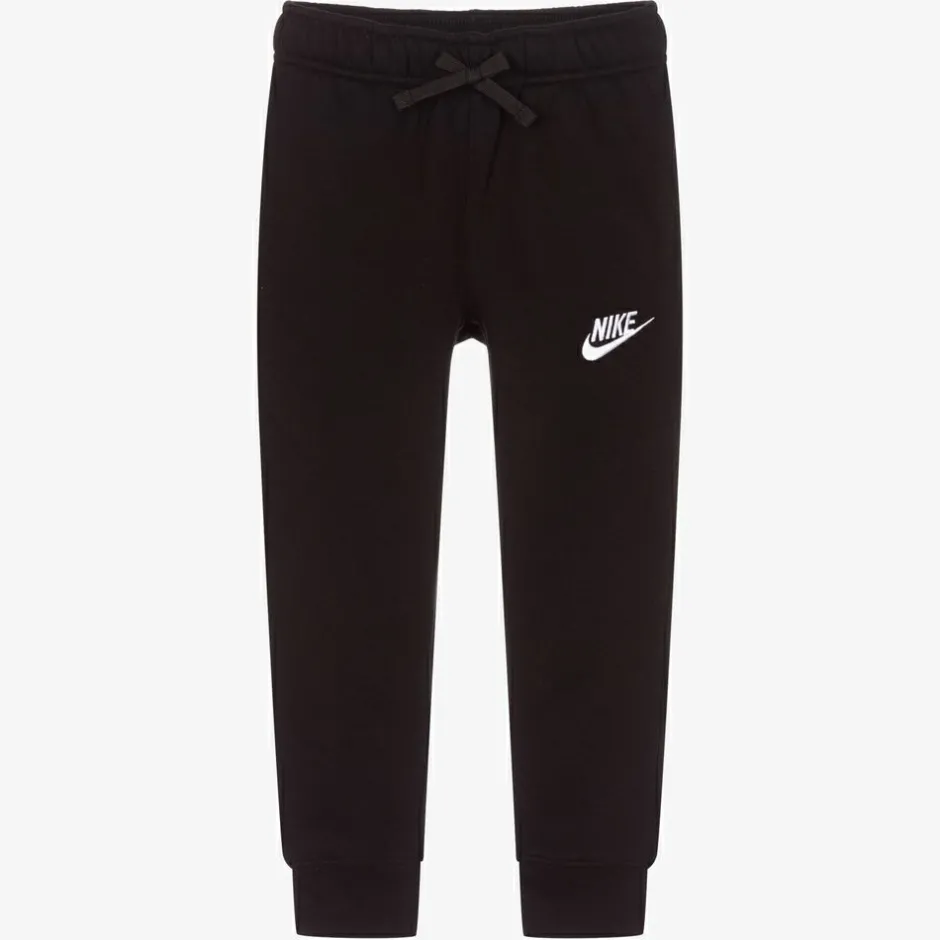 Boys black joggers by sports brand, Nike. The soft cotton-blend jersey has a fleece feel, with a brushed fleece interior. They have an adjustable drawstring waist, white logo embroidery and side pockets.
