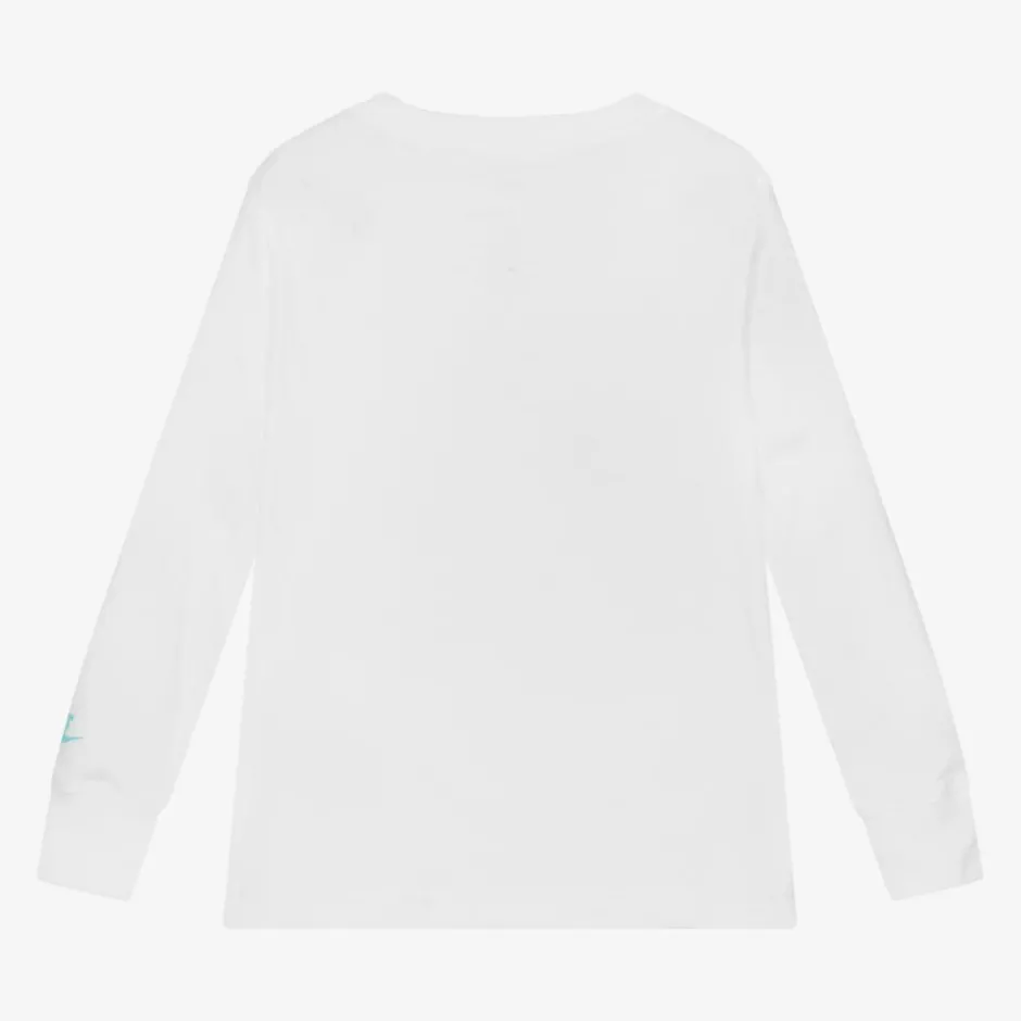 A white long-sleeved top for boys from Nike, made in a soft cotton jersey blend. This casual tee has a round neckline and gently ribbed cuffs. There is a fun graphic print on the front, featuring the well-known Swoosh logo and the brand's iconic 'Just Do It' slogan. Turquoise blue branding on the sleeve completes the look.