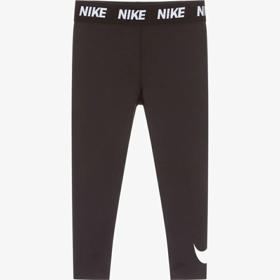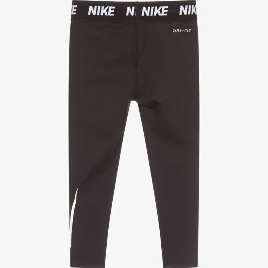 Girls black leggings by sports brand, Nike. Soft and stretchy, they have Dri-Fit technology to move sweat away from the skin for quicker evaporation. They are full-length and have a logo-branded, elasticated waistband and Swoosh logo in black on one leg.