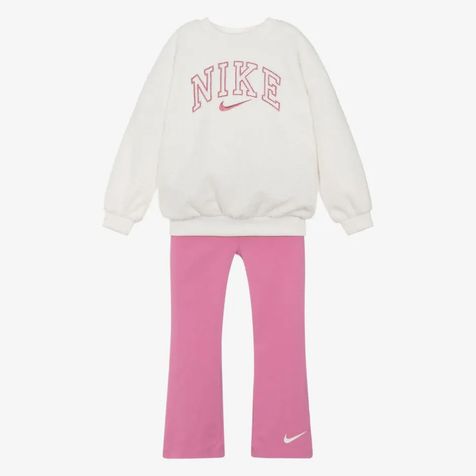 From Nike for girls, an ivory and pink leggings set for a cosy, sporty look. The soft towelling sweatshirt has a large shimmering embroidered logo, whilst the comfortable leggings are finished with the iconic Swoosh logo for brand recognition.