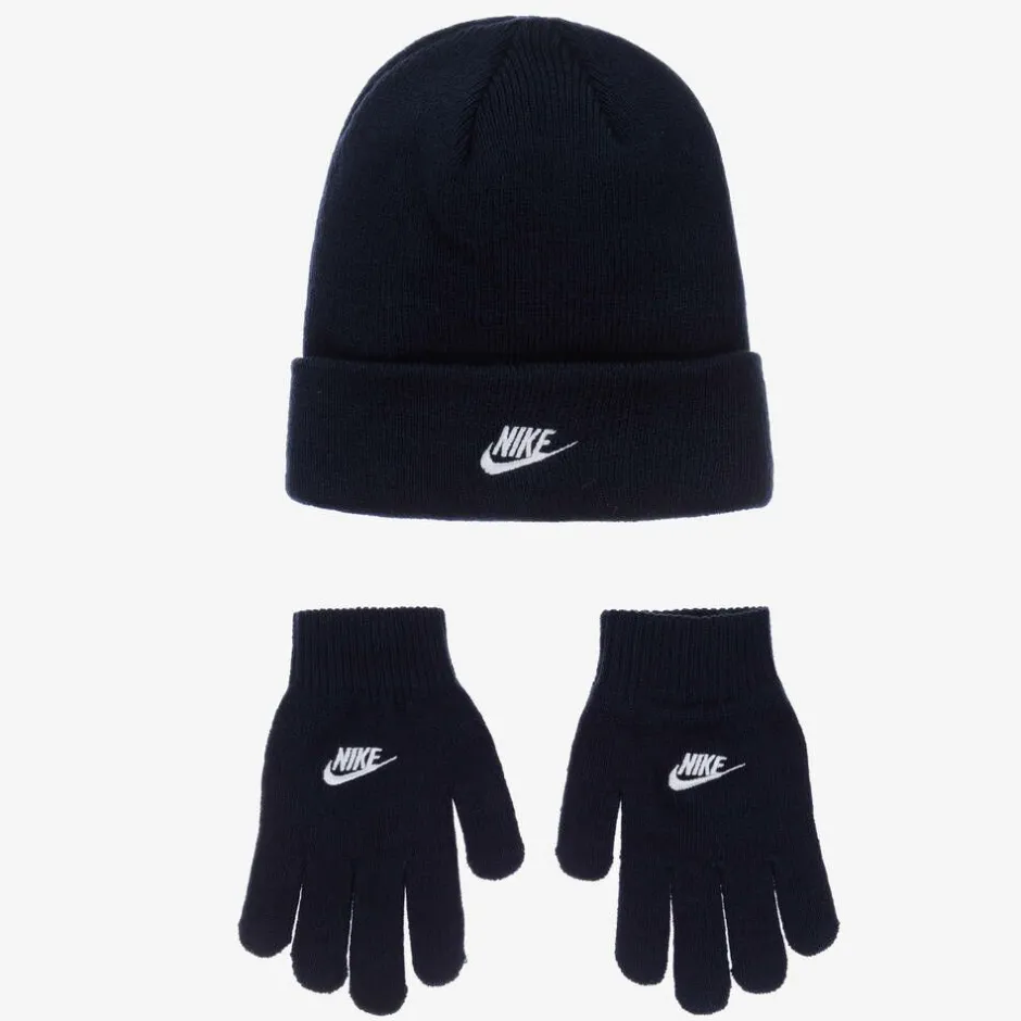 Navy blue beanie hat and gloves set for boys and girls by Nike. The cosy hat is made in a double knit layer for extra warmth and has a turned-up brim. A white Swoosh logo is embroidered on both the hat and gloves, adding designer appeal.