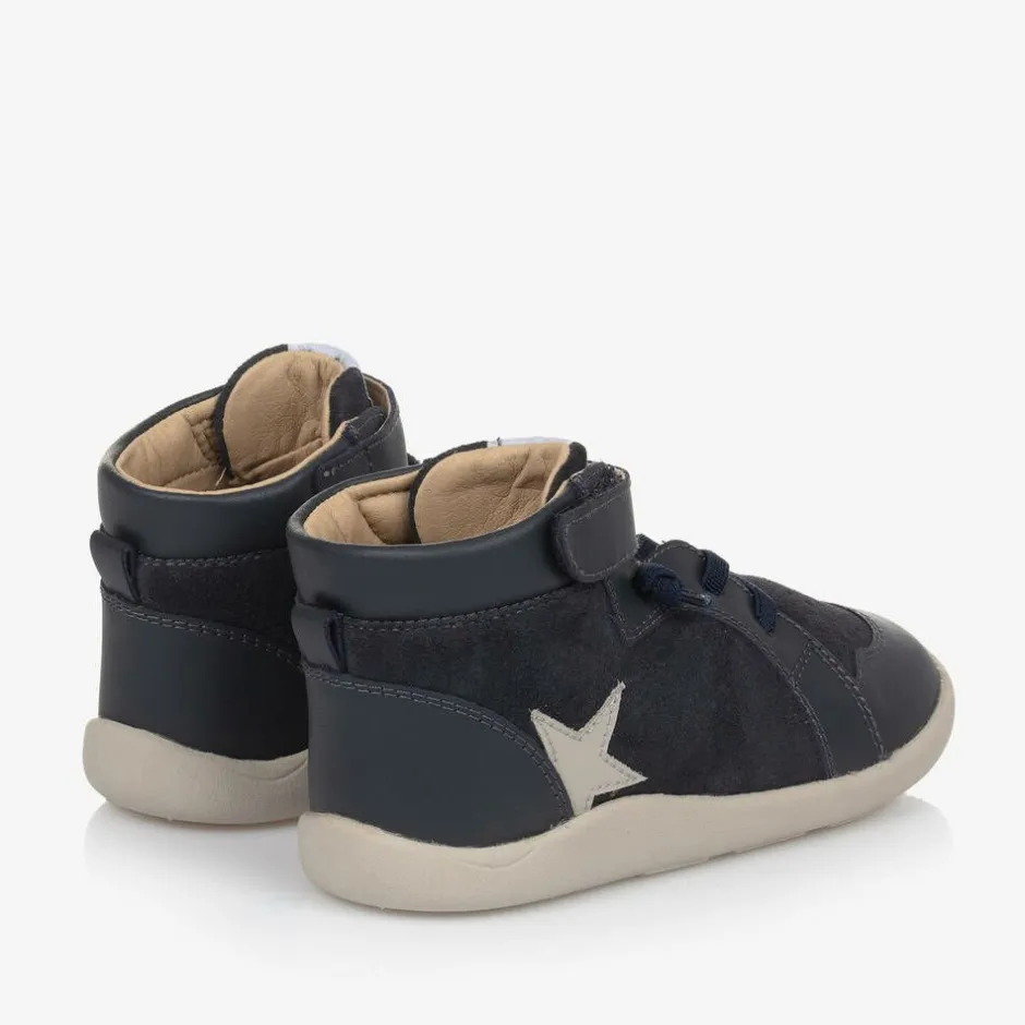 Navy blue high-top trainers for boys and girls by Australian footwear label Old Soles, in suede leather with smooth leather trim and a grey star appliqué. Soft, supple and comfortable to wear, they have a breathable microfibre lining and a removable cushioned insole that is absorbent and antibacterial to promote foot health. Podiatrist-approved, these lightweight shoes boast padded ankles, adjustable velcro and elastic laces for a secure fit. The outer sole is flexible and non-slip, helping to support posture and balance.