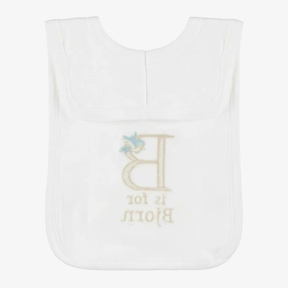 Cute white bib for baby boys and girls by Paint My Dreams, the British label. Made in soft cotton jersey for gentle comfort against delicate skin, this useful feeding accessory is ideal for catching small spills and dribble, and simply slips on over the head. Your little one's name can be embroidered below the 'B' initial and sweet bird motif, making a thoughtful gift.