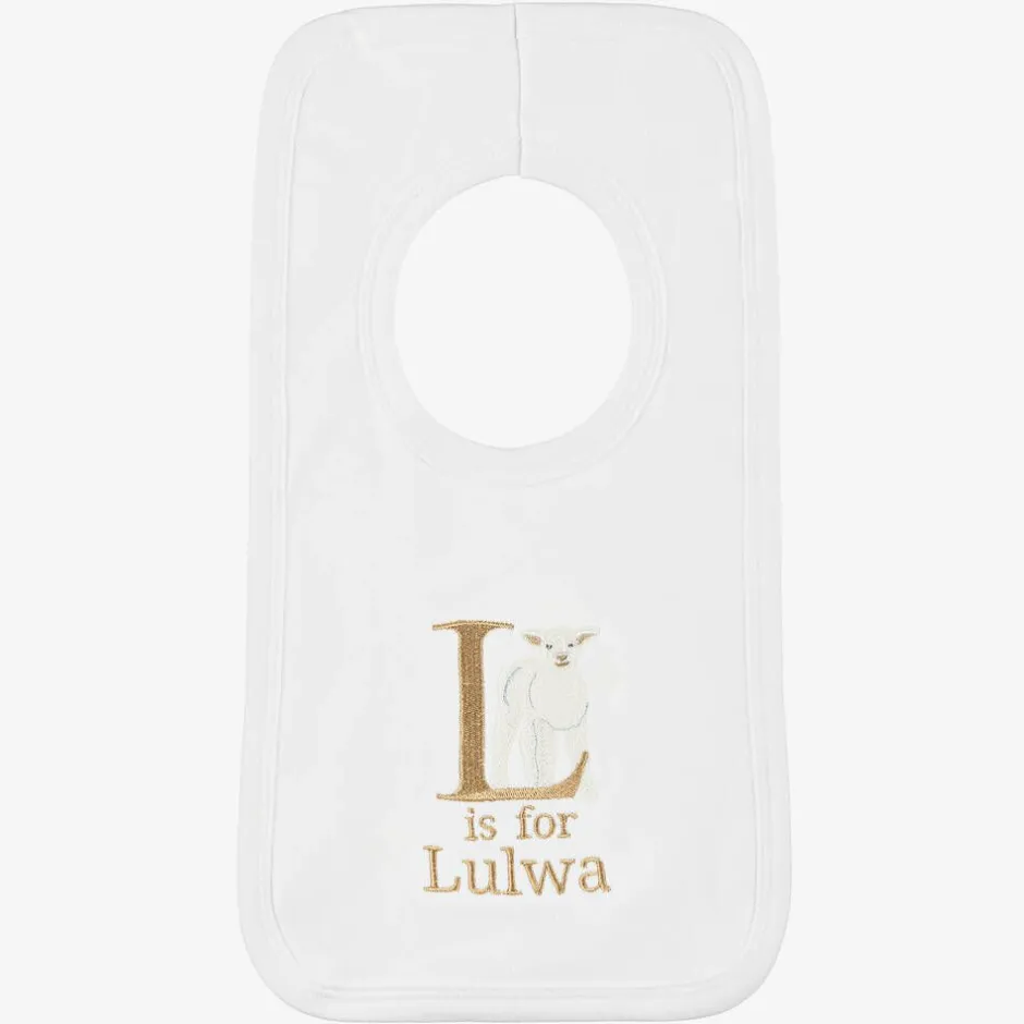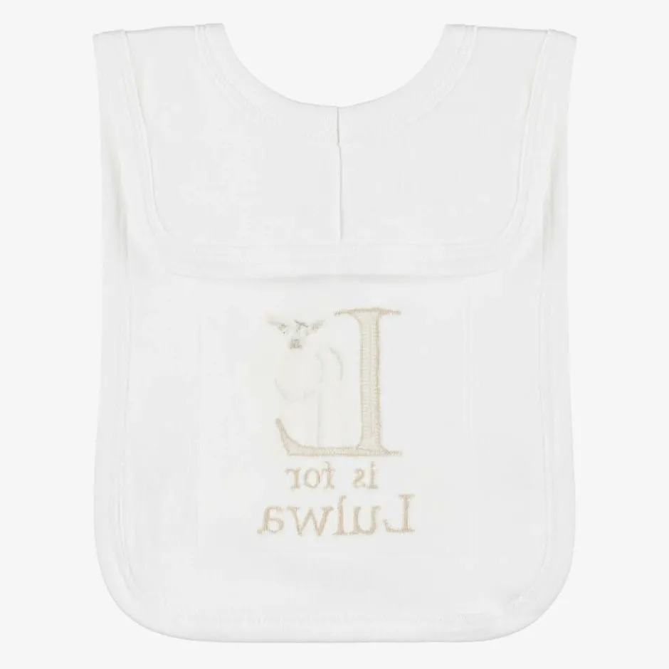 Cute white bib for baby boys and girls by Paint My Dreams, the British label. Made in soft cotton jersey for gentle comfort against delicate skin, this useful feeding accessory is ideal for catching small spills and dribble, and simply slips on over the head. Your little one's name can be embroidered below the 'L' initial and sweet lamb motif, making a thoughtful gift.