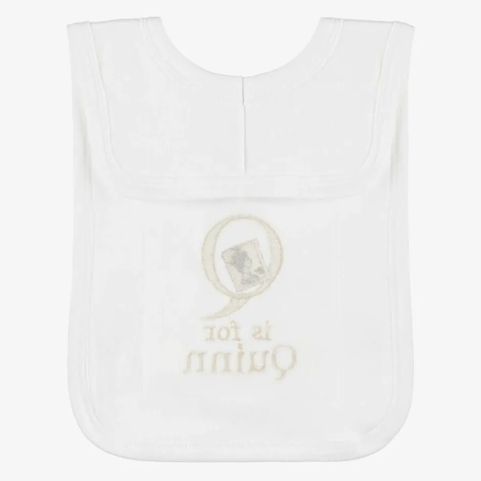 Cute white bib for baby boys and girls by Paint My Dreams, the British label. Made in soft cotton jersey for gentle comfort against delicate skin, this useful feeding accessory is ideal for catching small spills and dribble, and simply slips on over the head. Your little one's name can be embroidered below the 'Q' initial and sweet stamp motif, making a thoughtful gift.