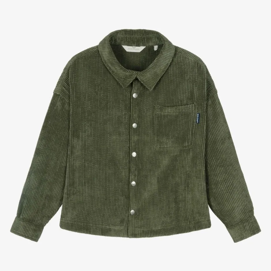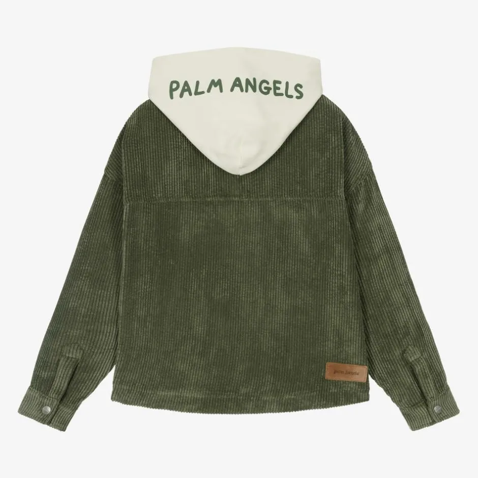 Khaki green overshirt for older boys from Palm Angels, made in soft and comfortable corduroy. Designed in a relaxed, oversized fit, this cool shaket has a chest patch pocket and logo-embossed popper fastenings on the front and cuffs. For alternative styling, it has a detachable ivory jersey hood, featuring a bold, green logo print for instant designer appeal.
