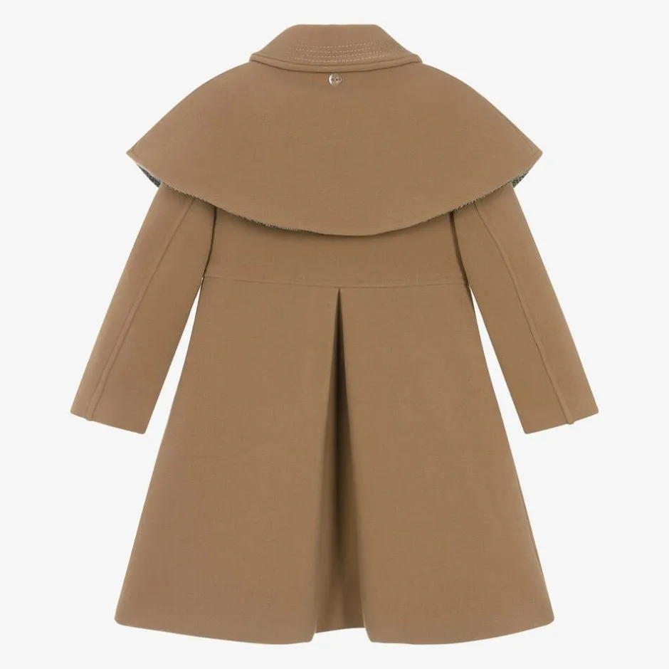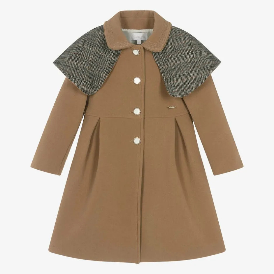Dark beige coat for girls by Portuguese brand Patachou, in a traditional style. It has a detachable, reversible shawl around the shoulders, one side dark beige, one side in grey herringbone. The collar has smart stitched detailing and there is a golden logo tab sewn by the waist. The coat has inverted pleats on the front and back and fastens with ivory and gold buttons on the front. It is lined in lightweight, silky satin with an eye-catching horse motif.