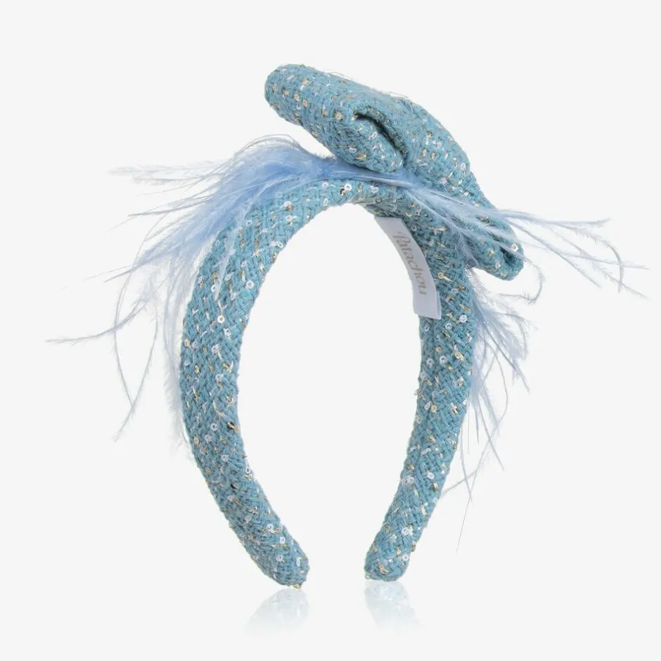 Chic blue hairband for girls by Patachou, woven in soft tweed with shiny gold thread and sequins adding a touch of sparkle. Exclusive to Childrensalon, it features a wide flexible band topped with a padded bow and feather trims.