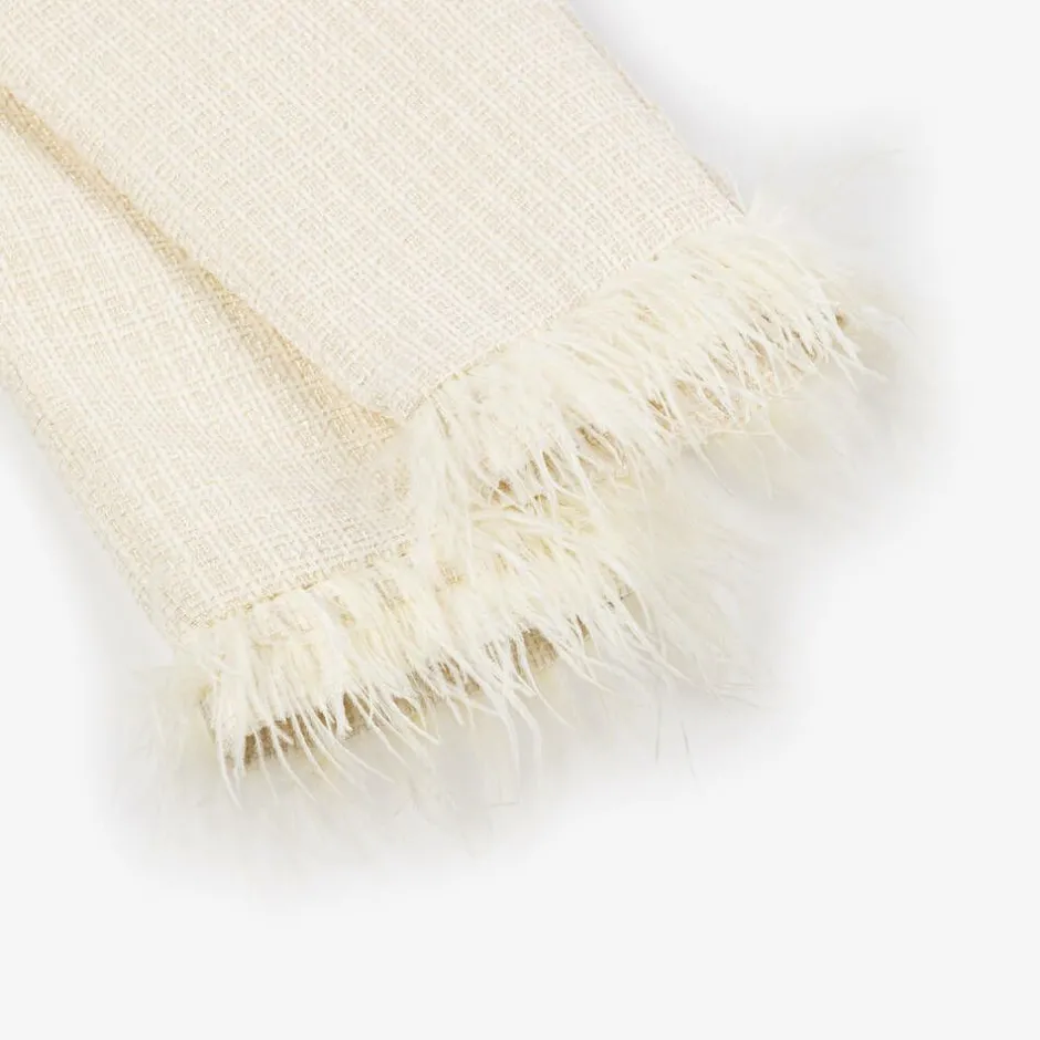 Exclusive to Childrensalon, a chic, ivory tweed trouser set for girls by Patachou, woven with a subtle, sparkly thread. Ideal for a special occasion, both pieces have eye-catching feather trims and are fully lined with cotton for comfort. The short-sleeved jacket has patch pockets, a peplum hem and beautiful pearl and diamanté buttons for a glamorous touch. The stylish trousers have an adjustable waistband and side zip fastening with a matching, statement button.