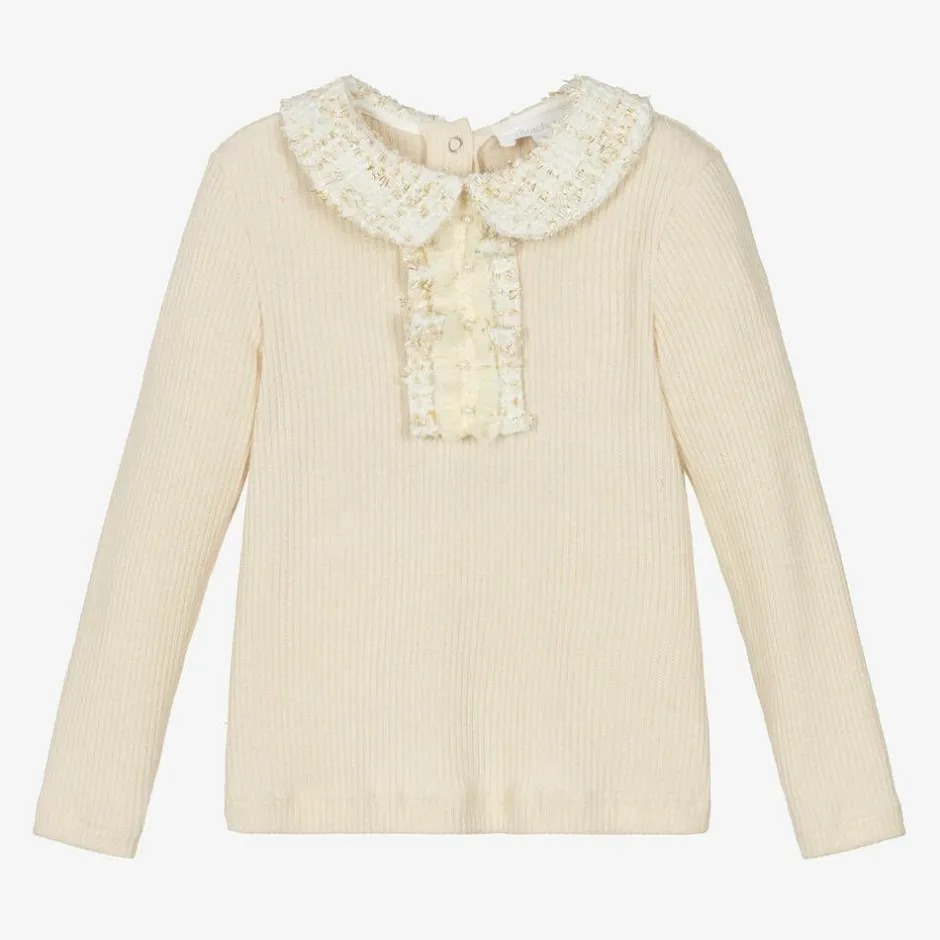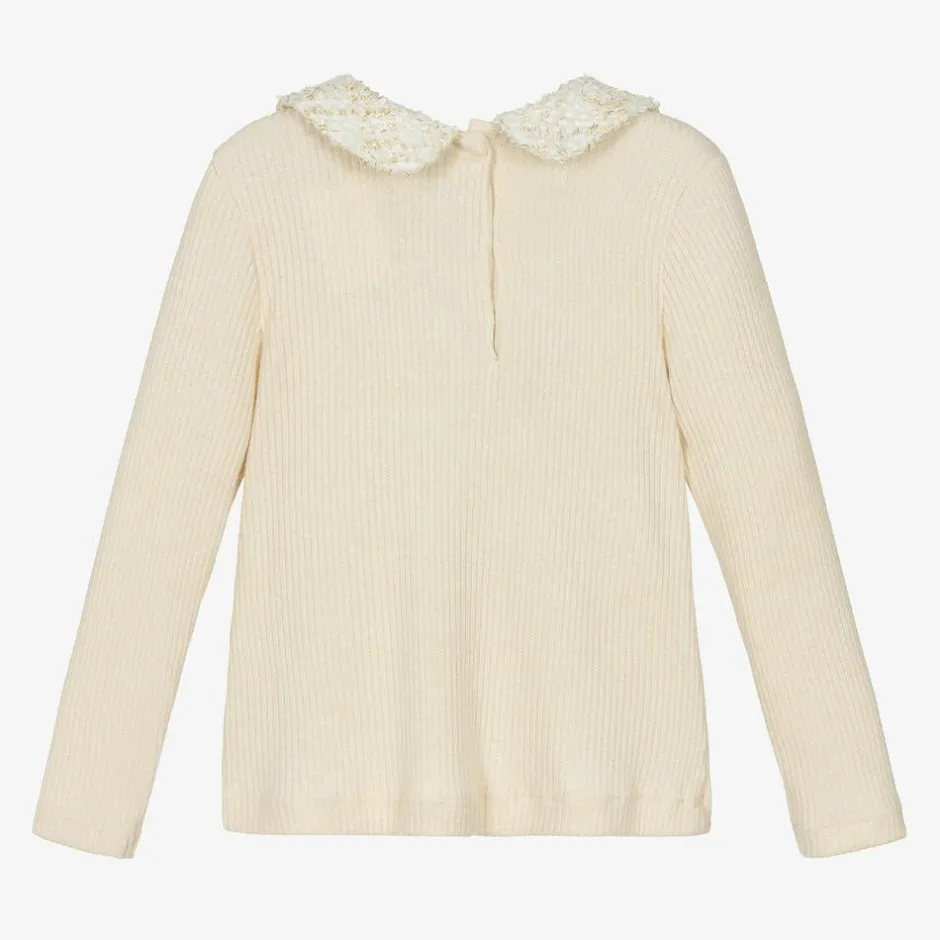 Smart ivory sweater for girls by Portuguese brand Patachou, sparkling with shiny gold thread in the weave. Knitted in a super soft viscose blend, it has a stylish tweed collar with a coordinating, ruffled faux placket below, embellished with a chiffon trim and pearl beads. The sweater has long sleeves and fastens on the back with neat, concealed poppers.
