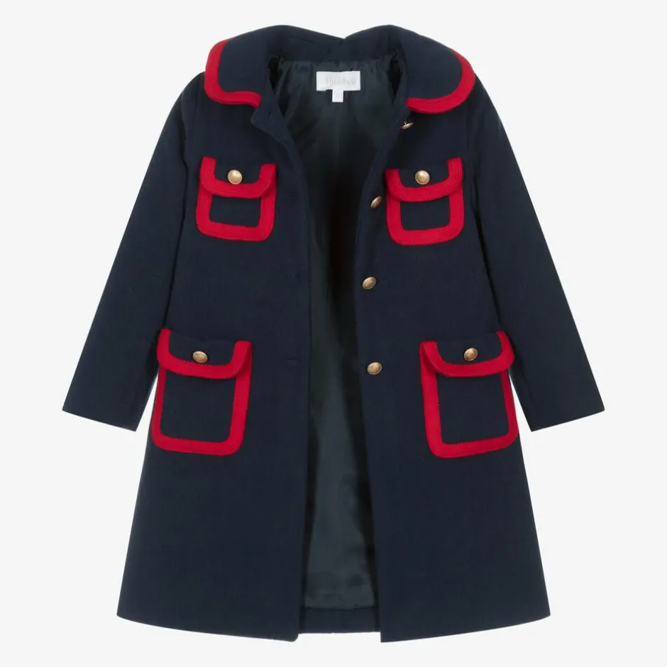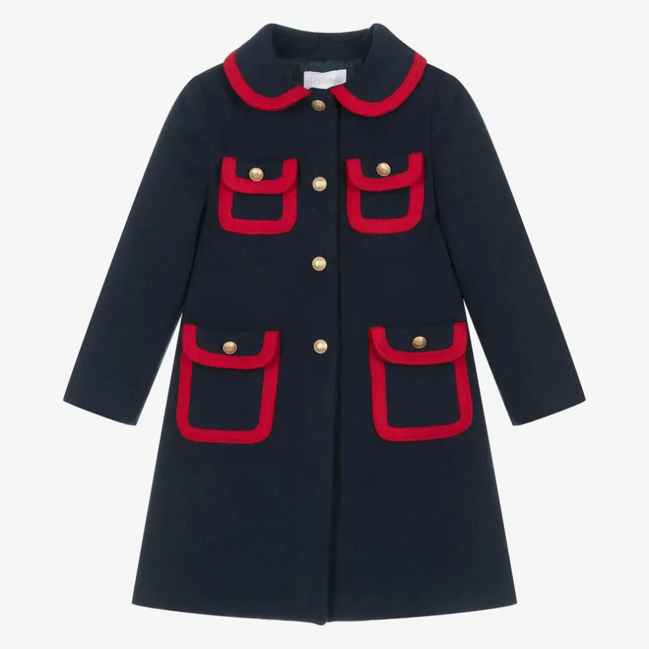 Smart navy blue coat for girls by Portuguese brand Patachou, with red trim for an eye-catching touch. Styled with a martingale belt on the back, this traditional design is made in soft felted fabric for a cosy feel, with a satin lining for comfort. It fastens with gold-tone crest buttons, matching the decorative buttons on the front pockets.