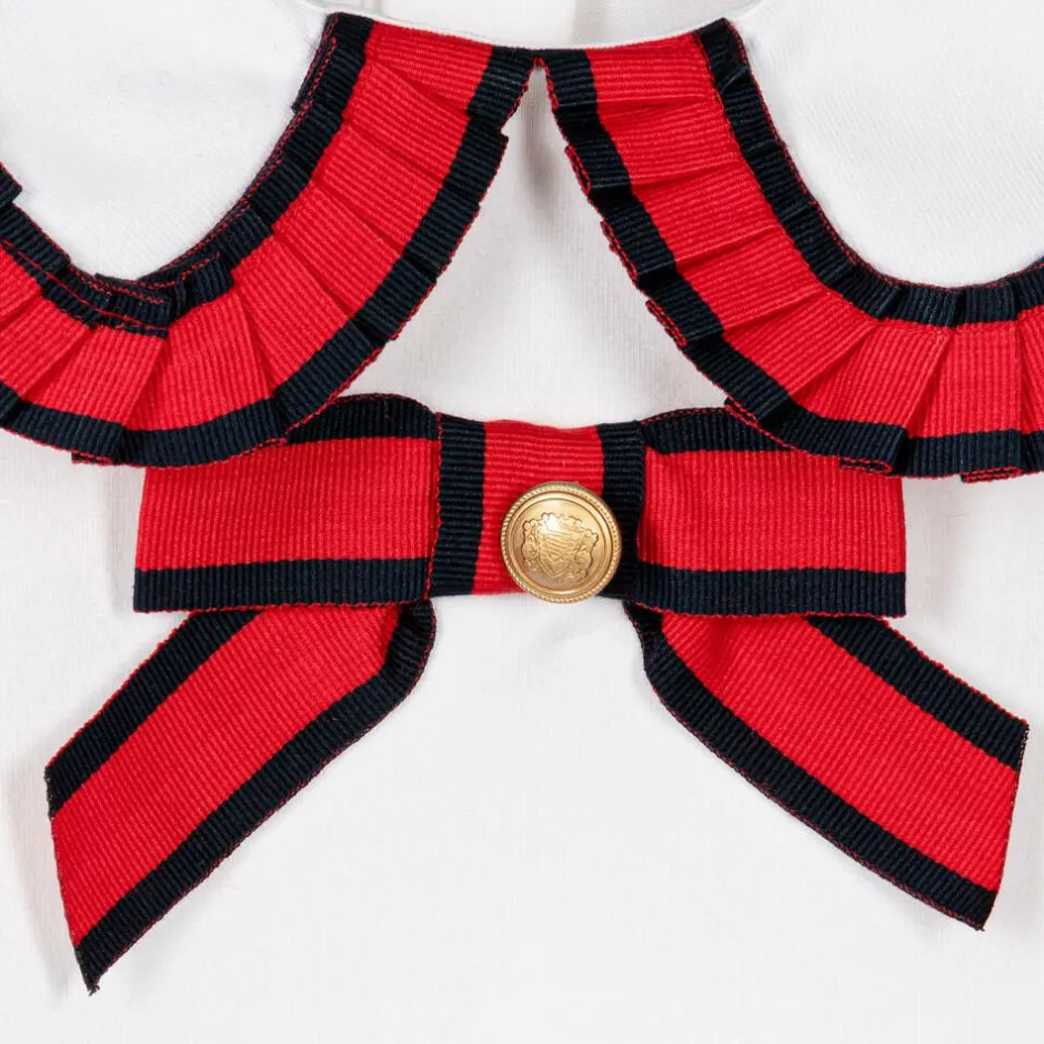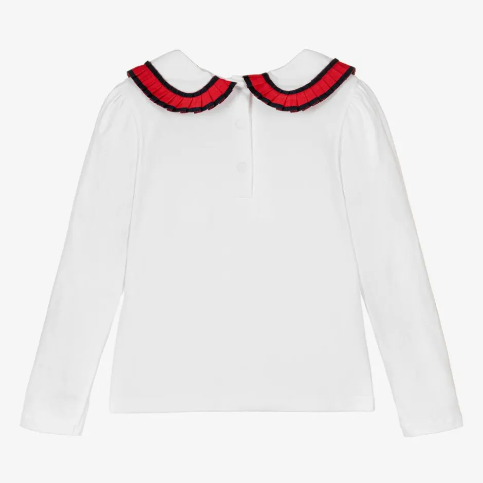 A white cotton top for girls by Patachou, exclusive to Childrensalon. Made in comfortable jersey, this smart and elegant top has pleated grosgrain trims on the collar and a decorative bow, all in red and navy blue. A golden faux button embossed with a crest adds that preppy feel. This long-sleeved top has poppers on the back for simple dressing.