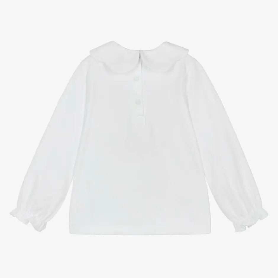 Combining comfort and style for girls, this white long-sleeved top is from Portuguese brand Patachou. Made in beautifully soft cotton jersey, it has a scalloped twill collar and a grosgrain ribbon bow in navy blue and grey on the front, with a decorative crest button. The long sleeves have gently elasticated, frilled cuffs and there are popper fastenings on the back.