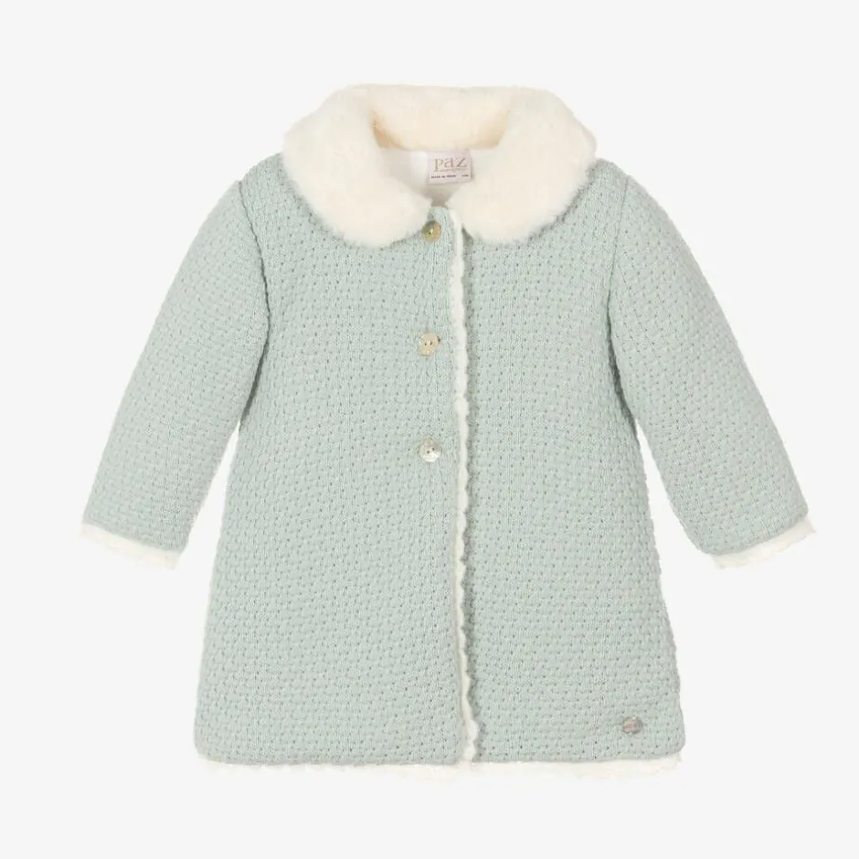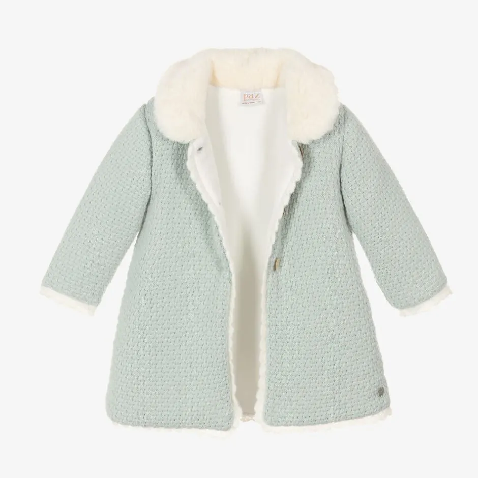 Pale aqua green softly knitted coat for baby girls by Spanish label Paz Rodriguez. Traditionally styled, this cosy coat has a super soft faux fur collar and a pretty scalloped knit trim. Lined in soft velour for extra warmth, it fastens with mother-of-pearl branded buttons on the front. A delicate logo charm stitched just above the hem adds a sweet designer finish.